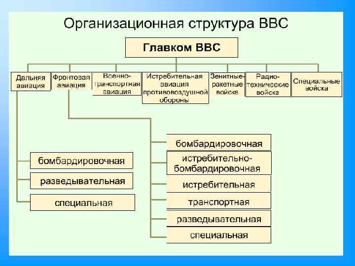 Военно-воздушные силы (ВВС) – вид Вооруженных Сил Российской Федерации. Они предназначены для ведения разведки группировок противника; обеспечения завоевания господства (сдерживания) в воздухе; защиты от ударов с воздуха важных военно-экономических районов (объектов) страны и группировок войск; предупреждения о воздушном нападении; поражения объектов, составляющих основу военного и военноэкономического потенциала противника; поддержки с воздуха сухопутных войск и сил флота; десантирования воздушных десантов; перевозки войск и материальных средств по воздуху.