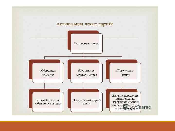 Отношение народа и партий к войне Первая мировая война внесла изменения в деятельность политических партий России. О сплочении вокруг трона заявили все монархические партии. Среди социалистов единства не было. Эсеры и социалдемократы разделились на три группы: оборонцы, центристы (пацифисты) и пораженцы. Оборонцы (Г. В. Плеханов) призывали к защите Отечества, прекращению на время войны всех революционных выступлений; они могут ослабить «силу сопротивления России неприятельскому нашествию» . Центристы (Ю. О. Мартов, В. М. Чернов) выступили за немедленное заключение демократического мира всеми воюющими державами. Лидером пораженцев был В. И. Ленин.