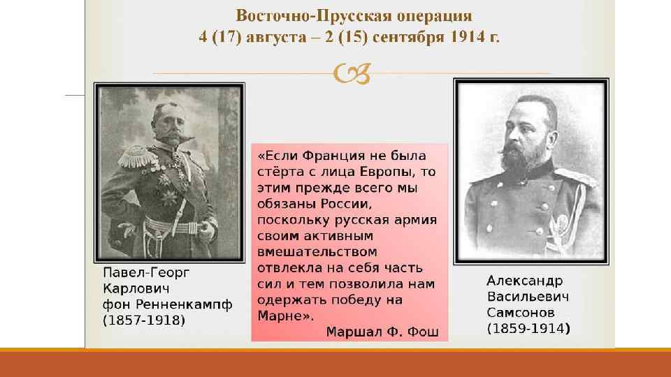 Первый год войны ВОСТОЧНО-ПРУССКАЯ ОПЕРАЦИЯ В сентябре немцы форсировали р. Марна и вышли на направление прямого удара по Парижу. Франция оказалась на грани поражения. С целью недопущения разгрома Франции начинается Восточно-Прусская операция. Из-за несогласованности действий между 1 и 2 армиями, а также штабом завершилась тактическим поражением русской армии, но стратегически была победой России, сорвавшей общий план Германии на войну.