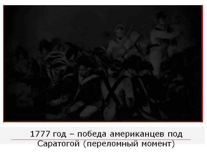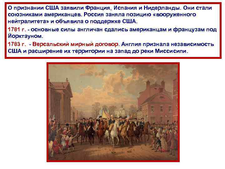 О признании США заявили Франция, Испания и Нидерланды. Они стали союзниками американцев. Россия заняла позицию «вооруженного нейтралитета» и объявила о поддержке США. 1781 г. - основные силы англичан сдались американцам и французам под Йорктауном. 1783 г. - Версальский мирный договор. Англия признала независимость США и расширение их территории на запад до реки Миссисипи.