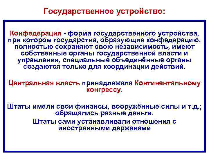 Государственное устройство: Конфедерация - форма государственного устройства, при котором государства, образующие конфедерацию, полностью сохраняют свою независимость, имеют собственные органы государственной власти и управления, специальные объединённые органы создаются только для координации действий. Центральная власть принадлежала Континентальному конгрессу. Штаты имели свои финансы, вооружённые силы и т. д. ; обращались разные деньги. Штаты сами устанавливали отношения с иностранными державами