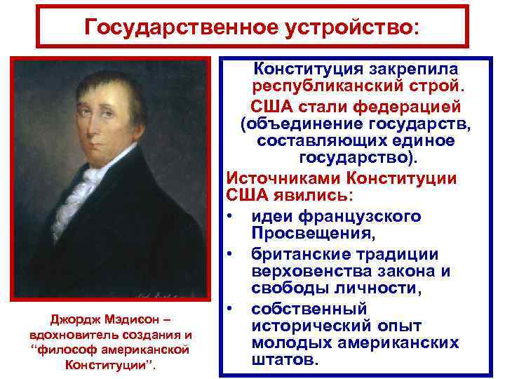 Государственное устройство: Джордж Мэдисон – вдохновитель создания и “философ американской Конституции”. Конституция закрепила республиканский строй. США стали федерацией (объединение государств, составляющих единое государство). Источниками Конституции США явились: • идеи французского Просвещения, • британские традиции верховенства закона и свободы личности, • собственный исторический опыт молодых американских штатов.