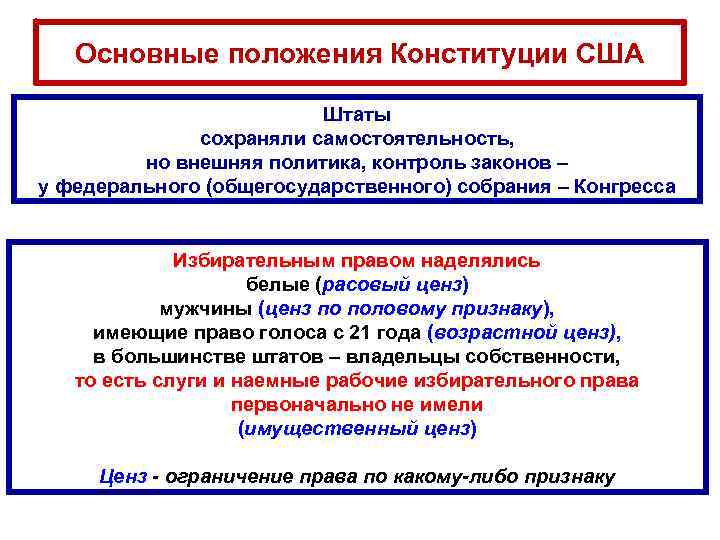 Основные положения Конституции США Штаты сохраняли самостоятельность, но внешняя политика, контроль законов – у федерального (общегосударственного) собрания – Конгресса Избирательным правом наделялись белые (расовый ценз) мужчины (ценз по половому признаку), имеющие право голоса с 21 года (возрастной ценз), в большинстве штатов – владельцы собственности, то есть слуги и наемные рабочие избирательного права первоначально не имели (имущественный ценз) Ценз - ограничение права по какому-либо признаку