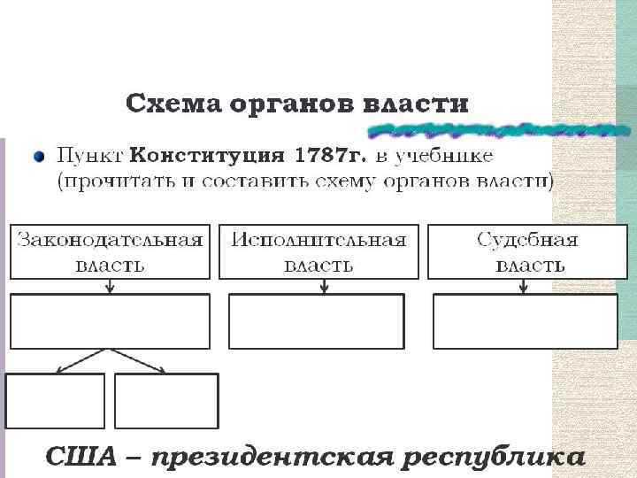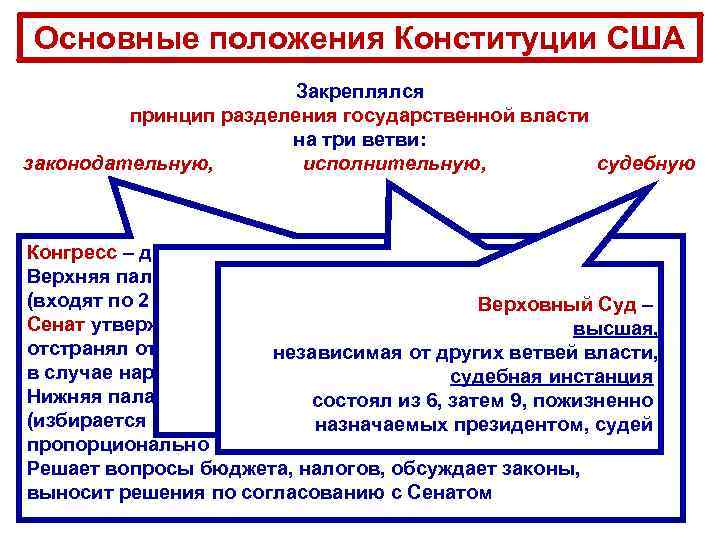 Основные положения Конституции США Закреплялся принцип разделения государственной власти на три ветви: законодательную, исполнительную, судебную Конгресс – двухпалатный парламент США. Верхняя палата – Сенат Президент США (входят по 2 сенатора от каждого штата). (избирается на 4 года) – Верховный Суд – Сенат утверждал назначение на государственные посты, высшая, глава государства, отстранял от должности независимая от других лиц высших должностных ветвей власти, Главнокомандующий, в случае нарушения ими законов – импичмент. судебная инстанция формирует правительство Нижняя палата – Палата представителей затем 9, пожизненно состоял из 6, и назначает послов (избирается населением на 2 назначаемых президентом, судей года пропорционально численности населения штата). Решает вопросы бюджета, налогов, обсуждает законы, выносит решения по согласованию с Сенатом