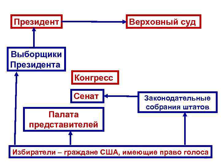 Президент Верховный суд Выборщики Президента Конгресс Сенат Палата представителей Законодательные собрания штатов Избиратели – граждане США, имеющие право голоса 19