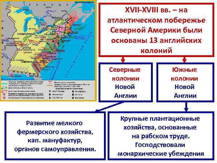 XVII-XVIII вв. – на атлантическом побережье Северной Америки были основаны 13 английских колоний Северные колонии Новой Англии Развитие мелкого фермерского хозяйства, кап. мануфактур, органов самоуправления. Южные колонии Новой Англии Крупные плантационные хозяйства, основанные на рабском труде. Господствовали монархические убеждения