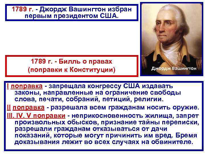 1789 г. - Джордж Вашингтон избран первым президентом США. 1789 г. - Билль о правах (поправки к Конституции) Джордж Вашингтон I поправка - запрещала конгрессу США издавать законы, направленные на ограничение свободы слова, печати, собраний, петиций, религии. II поправка - разрешала всем гражданам носить оружие. III. IV. V поправки - неприкосновенность жилища, запрет произвольных обысков, признание тайны переписки, разрешали гражданам отказываться от дачи показаний, которые могут причинить им вред. Бремя доказывания лежит во всех случаях на обвинителе.