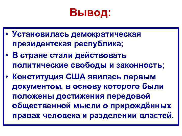 Вывод: • Установилась демократическая президентская республика; • В стране стали действовать политические свободы и законность; • Конституция США явилась первым документом, в основу которого были положены достижения передовой общественной мысли о прирождённых правах человека и разделении властей.