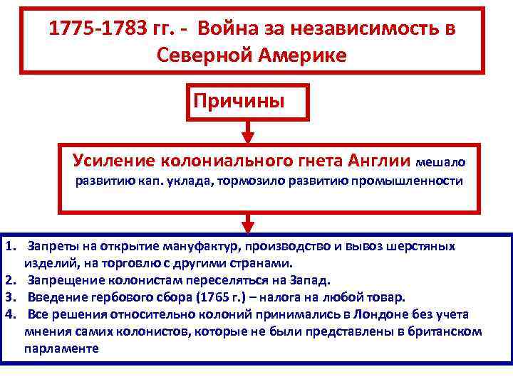 1775 -1783 гг. - Война за независимость в Северной Америке Причины Усиление колониального гнета Англии мешало развитию кап. уклада, тормозило развитию промышленности 1. Запреты на открытие мануфактур, производство и вывоз шерстяных изделий, на торговлю с другими странами. 2. Запрещение колонистам переселяться на Запад. 3. Введение гербового сбора (1765 г. ) – налога на любой товар. 4. Все решения относительно колоний принимались в Лондоне без учета мнения самих колонистов, которые не были представлены в британском парламенте