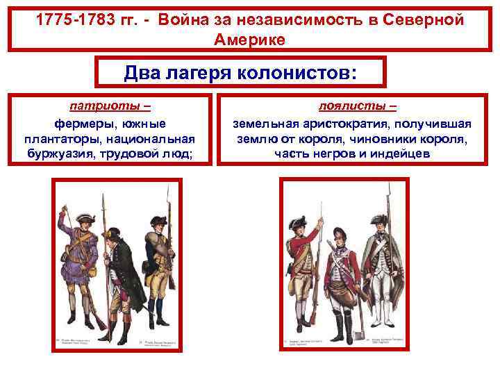 1775 -1783 гг. - Война за независимость в Северной Америке Два лагеря колонистов: патриоты – фермеры, южные плантаторы, национальная буржуазия, трудовой люд; лоялисты – земельная аристократия, получившая землю от короля, чиновники короля, часть негров и индейцев