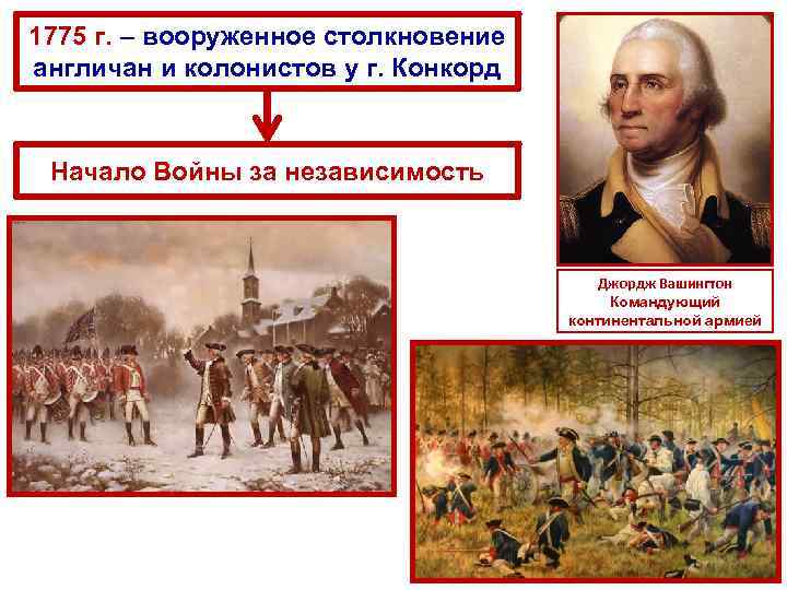 1775 г. – вооруженное столкновение англичан и колонистов у г. Конкорд Начало Войны за независимость Джордж Вашингтон Командующий континентальной армией