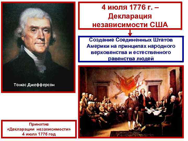 4 июля 1776 г. – Декларация независимости США Создание Соединенных Штатов Америки на принципах народного верховенства и естественного равенства людей Томас Джефферсон Принятие «Декларации независимости» 4 июля 1776 год