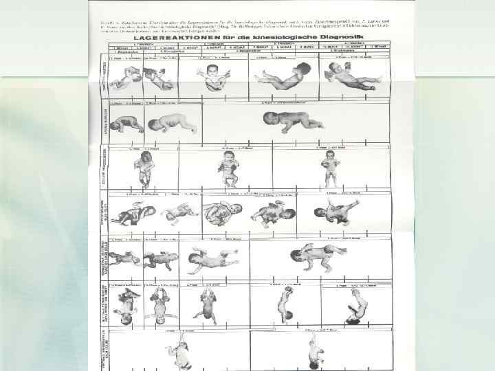 n n Каждая реакция на положение имеет свой четкий рисунок (отражение), кинезиологическим определением которого есть глобальный, часть и типичный для возраста двигательный ответ. На основе реакций на положение в диагностике по Войта можно установит достаточно точный возрастной период развития. Отсюда возникает новое понятие “период реакций на положение тела”. Период развития сравнивается с хронологическим развитием или гестационным (срок беременности). Таким образом, может быть определена задержка в неврологическом развитии.
