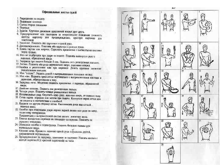 Жесты судей: Судьи должны показывать официальными жестами причину своих свистков (характер совершенной ошибки или цель разрешенного перерыва). Жест некоторое время выдерживается и, если он показывается одной рукой, используемая рука соответствует стороне команды, которая сделала ошибку или выразила просьбу. Судьи на линии должны показывать официальными сигналами флагом характер ошибки и выдерживать сигнал некоторое время.