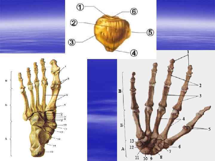 § У человека число костей в запястье и предплюсне уменьшилось, в частности в кисти исчезли самостоятельные центральные кости, а в стопе они слились в единую ладьевидную кость. Благодаря расчлененности на лучи и наличию множества мелких костных элементов увеличивается опорная поверхность дистальных частей конечностей и обеспечивается адаптивное изменение формы стопы при ходьбе и формы кисти при манипулировании с различными предметами.