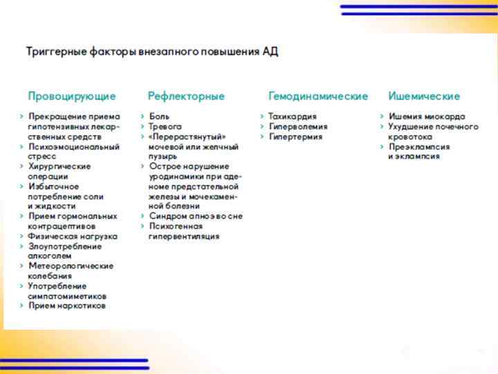 Предрасполагающие состояния • Состояния гипертонической болезни (в том числе ее первое проявление) • Симптоматические артериальные гипертензии (феохромоцитома, вазоренальная артериальная гипертензия, тиреотоксикоз) • Острый гломерулонефрит • Преэклампсия и эклампсия • Диффузные заболевания соединительной ткани с вовлечением почек • Черепно-мозговая травма • Тяжелые ожоги