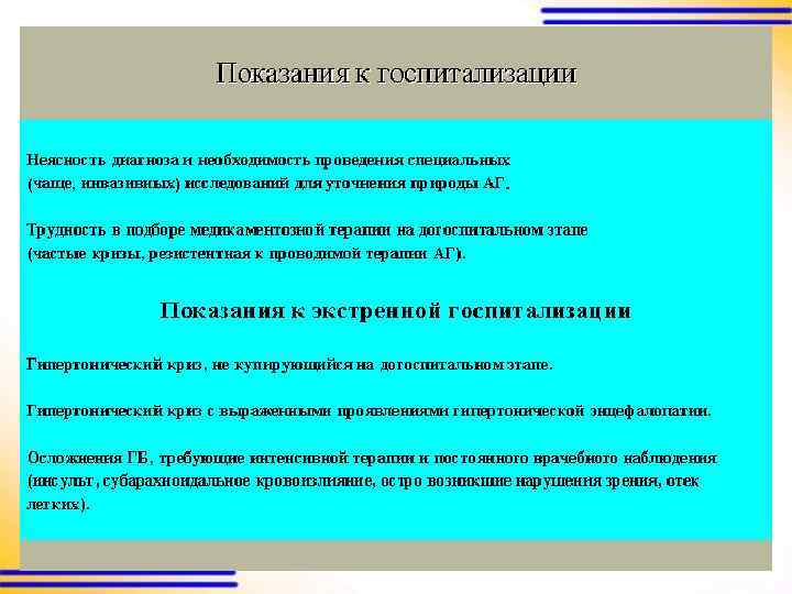 Скорость снижения АД при неосложненном гипертоническом кризе 1) возможно как внутривенное, так и пероральное применение гипотензивных лекарственных средств 2) скорость снижения АД не должна превышать 25% в первые 2 часа 3) достижение целевого АД в течение нескольких часов (не более 24 – 48 часов) от начала терапии.