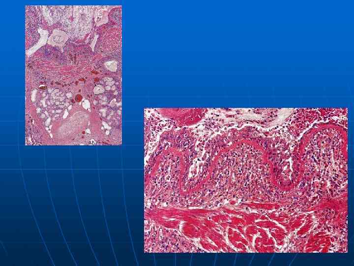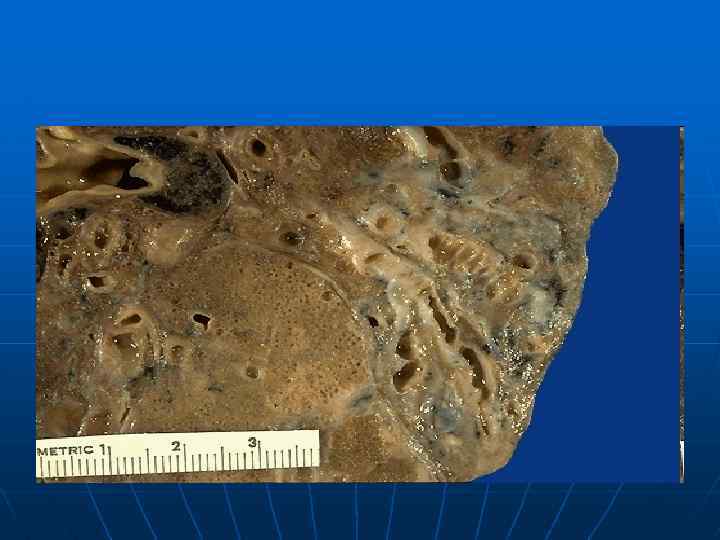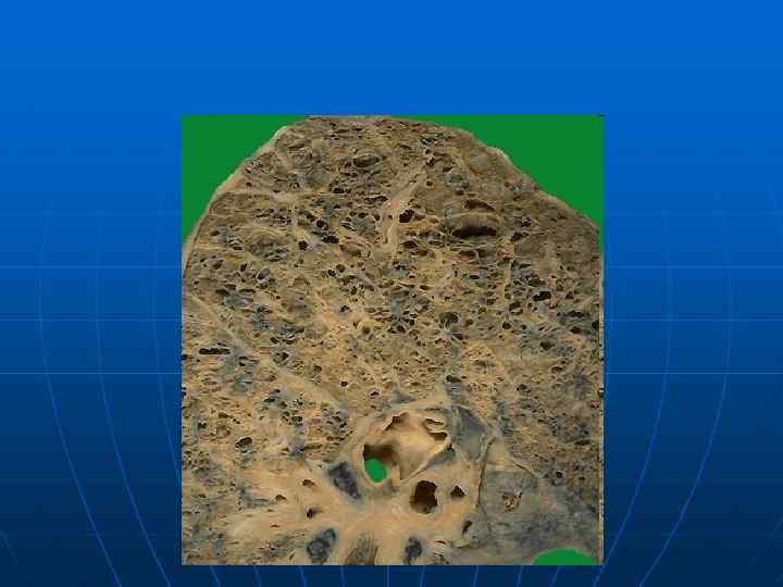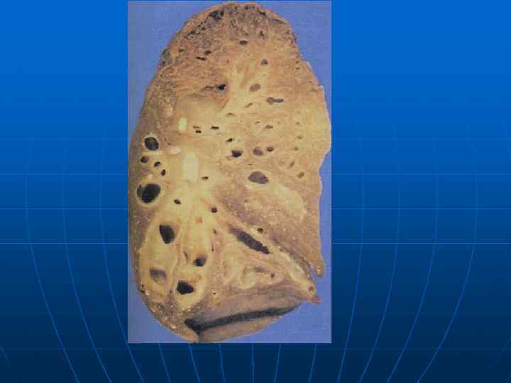 Патологическая анатомия бронхоэктатической болезни n n n Патологическая анатомия бронхоэктатической болезни складывается из сочетания выраженных бронхоэктазов и внелегочного симптомокомплекса. Наиболее часто поражаются бронхи нижней доли правого легкого. При микроскопическом исследовании в полости бронхоэктаза обнаруживается гнойный экссудат, содержащий микробные тела и слущенный эпителий. Покровный эпителий представлен оголенными базальными клетками, очагами полипоза и плоскоклеточной метаплазии. Базальная мембрана гиалинизирована, имеет гофрированный вид. Обнаруживаются дистрофия и разрушение хрящевой пластинки бронха, атрофия и разрушение мышечного и эластического слоев, склероз и диффузная гистио-лимфоцитарная воспалительная инфильтрация всех слоев стенки бронхоэктаза с примесью полиморфноядерных лейкоцитов. В прилежащей легочной паренхиме видны поля фиброза и очаги обструктивной эмфиземы легких.