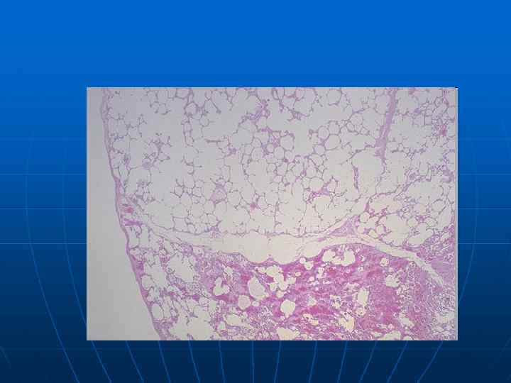Патологическая анатомия. n n n Легкие увеличены в размерах, прикрывают своими краями переднее средостение, вздутые, бледные, мягкие, не спадаются, режутся с хрустом. Из просветов бронхов выдавливается слизистогнойный экссудат. При микроскопическом исследовании характерно сочетание признаков хронического обструктивного бронхита и бронхиолита и эмфиземы легких. При этом можно выделить два основных морфологических варианта эмфиземы — центроацинарную и панацинарную.