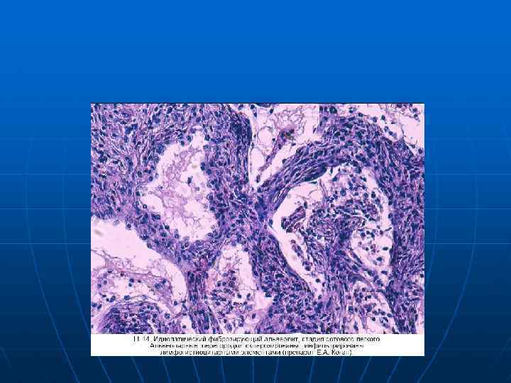 Классификация ИБЛ. n n Существует несколько принципов классификации ИБЛ, основными из которых являются этиология и характер продуктивного воспаления в легких. По этиологии ИБЛ подразделяются на заболевания с установленной и неустановленной этиологией. Среди основных ИБЛ с установленной этиологией следует назвать: пневмокониозы, вызванные органическими и неорганическими пылями, острые межуточные пневмонии [вирусные, грибковые, пневмоцистная, экзогенный аллергический альвеолит (лекарственный) и др. ]. Подавляющее большинство ИБЛ относятся к болезням с неустановленной этиологией, важнейшими из которых являются: идиопатический фиброзирующий альвеолит (болезнь Хамана—Рича), вторичный фиброзирующий альвеолит при ревматических болезнях, вторичный фиброзирующий альвеолит при HBv инфекции, легочные васкулиты, саркоидоз, фиброзирующий альвеолит при синдроме Гудпасчера и др. легочно-почечных синдромах, идиопатический гемосидероз легких, эозинофильная пневмония, гистиоцитоз Х, альвеолярный протеиноз, десквамативная интерстициальная пневмония и др.
