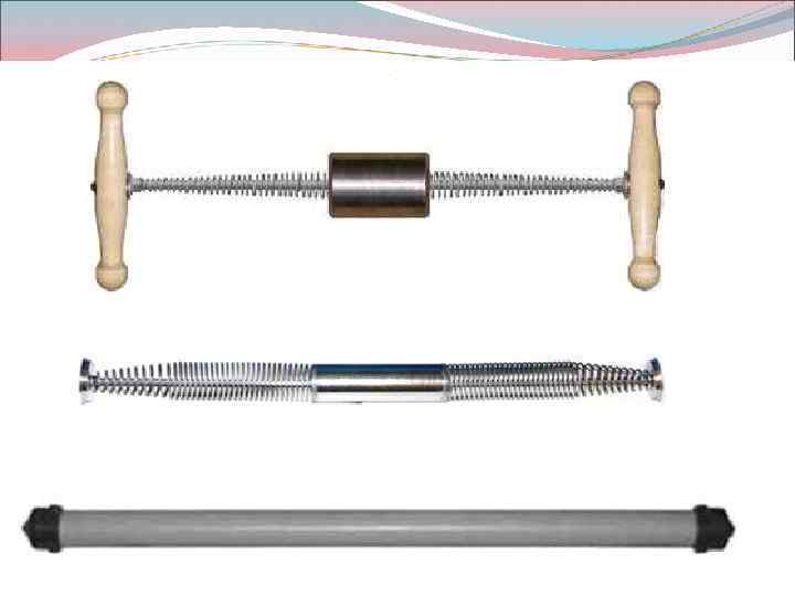 Методика - Время выполнения 1 упражнения от 5 сек до 1 мин - Время отдыха равно времени работы - Количество повторений от 1 -5 - Общая длительность от 3 мин до 40 -Количество занятий в день от 1 -5 - Общее правило выполнения упражнений с тренажером состоит в том, что тренажер всегда прочно держат в руках, а приведение его в колебания можно выполнять любой частью тела (кистями рук, плечами, туловищем, бедрами, коленями и голеностопными суставами). Чем дальше мы располагаем тренажер от биомеханических звеньев, приводящих его в колебания, тем большая часть скелетной мускулатуры воспринимает волновую нагрузку и тем более эффективно это упражнение.