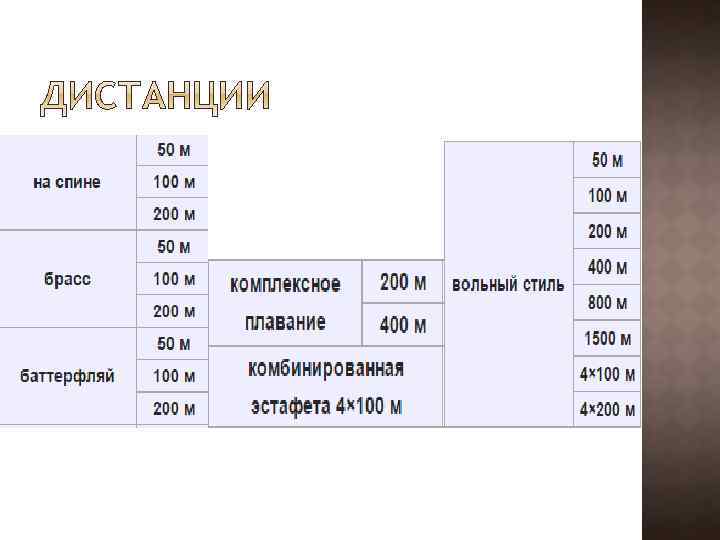 Дистанции, на которых регистрация мировых рекордов была прекращена: с 1 января 1949 — 300 ярдов, 300 м, 1000 ярдов и 1000 м вольным стилем, 400 м на спине, 400 м и 500 м брассом; с 1 января 1953 — 500 ярдов и 500 м вольным стилем, 150 ярдов на спине, 200 ярдов брассом, 300 м комплексного плавания, комбинированная эстафета 3× 100 м и 3× 100 ярдов; с 1 мая 1957 — 100 ярдов вольным стилем, на спине, брассом и баттерфляем, 1 миля, 4× 100 и 4× 200 ярдов вольным стилем, 400 ярдов комплексного плавания; с 1 мая 1969 — 110, 220, 440, 880, 1650, 4× 110 и 4× 220 ярдов вольным стилем, 110 и 220 ярдов на спине, брассом и баттерфляем, 220 и 440 ярдов комплексного плавания, комбинированная эстафета 4× 110 ярдов.