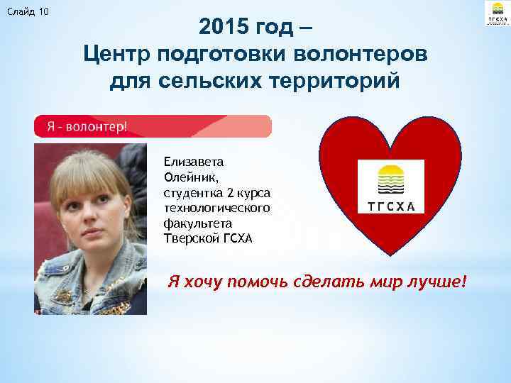 Слайд 10 2015 год – Центр подготовки волонтеров для сельских территорий Елизавета Олейник, студентка 2 курса технологического факультета Тверской ГСХА Я хочу помочь сделать мир лучше!
