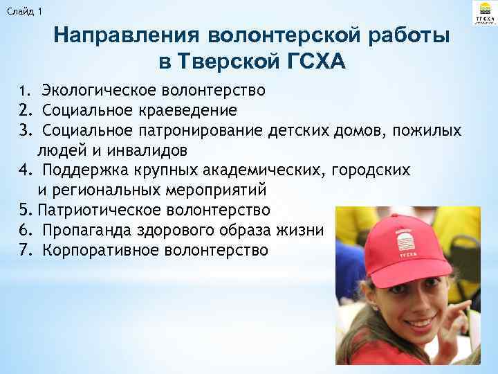 Слайд 1 Направления волонтерской работы в Тверской ГСХА 1. Экологическое волонтерство 2. Социальное краеведение 3. Социальное патронирование детских домов, пожилых людей и инвалидов 4. Поддержка крупных академических, городских и региональных мероприятий 5. Патриотическое волонтерство 6. Пропаганда здорового образа жизни 7. Корпоративное волонтерство