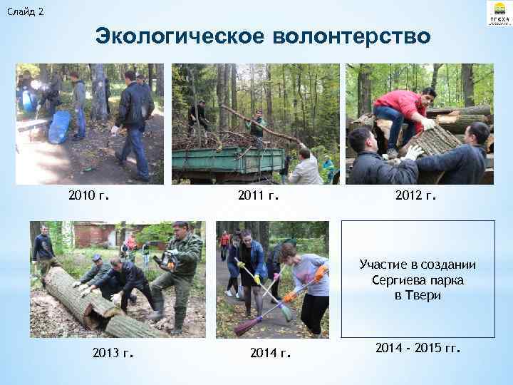 Слайд 2 Экологическое волонтерство 2010 г. 2011 г. 2012 г. Участие в создании Сергиева парка в Твери 2013 г. 2014 - 2015 гг.