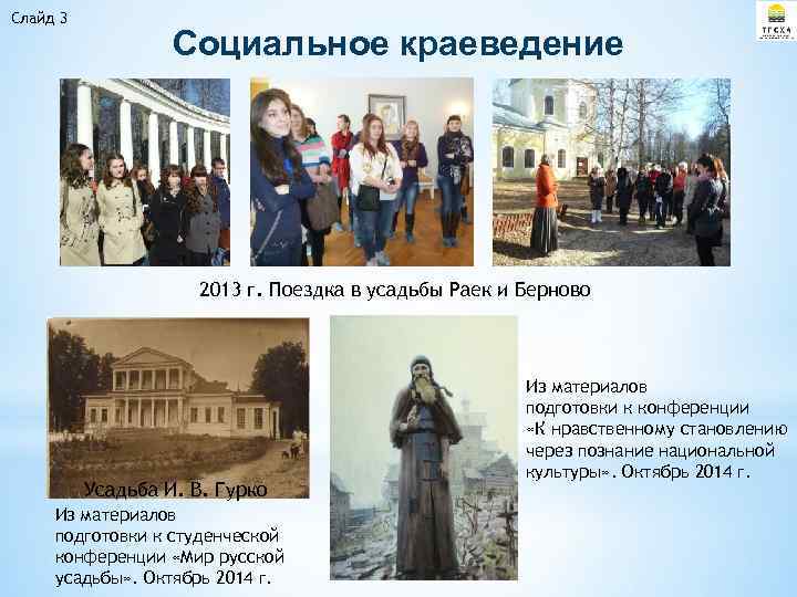 Слайд 3 Социальное краеведение 2013 г. Поездка в усадьбы Раек и Берново Усадьба И. В. Гурко Из материалов подготовки к студенческой конференции «Мир русской усадьбы» . Октябрь 2014 г. Из материалов подготовки к конференции «К нравственному становлению через познание национальной культуры» . Октябрь 2014 г.