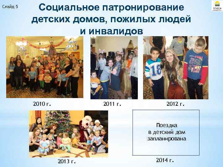 Слайд 5 Социальное патронирование детских домов, пожилых людей и инвалидов 2010 г. 2011 г. 2012 г. Поездка в детский дом запланирована 2013 г. 2014 г.