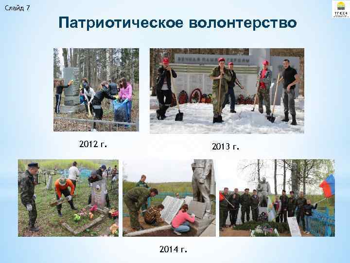 Слайд 7 Патриотическое волонтерство 2012 г. 2013 г. 2014 г.