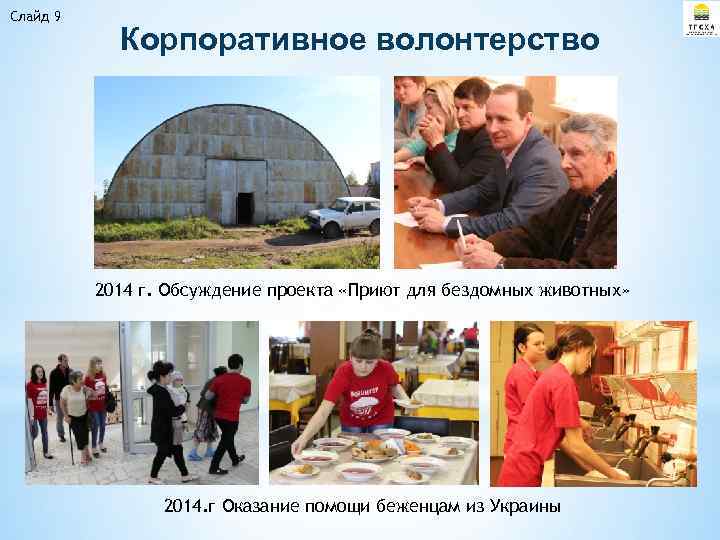 Слайд 9 Корпоративное волонтерство 2014 г. Обсуждение проекта «Приют для бездомных животных» 2014. г Оказание помощи беженцам из Украины