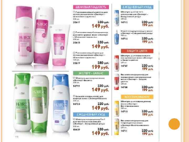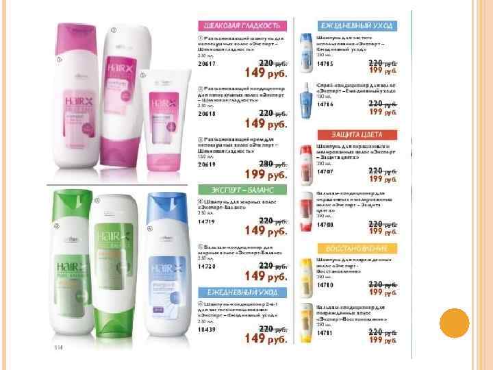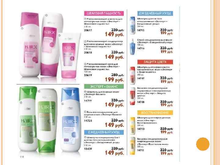 «Эксперт - Ежедневный уход» 14715 Шампунь для частого использования «Эксперт – Ежедневный уход» Обеспечивает волосам полноценный ежедневный уход – мягко очищает, увлажняет и восстанавливает эластичность и блеск. Нанесите на влажные волосы, вспеньте, затем смойте. Для наилучшего результата повторите процедуру. Для всех типов волос. 250 мл. 14716 Спрей-кондиционер для волос «Эксперт – Ежедневный уход» Мягко ухаживает за волосами, разглаживает и делает их послушными, предотвращая спутывание и облегчая укладку. Нанесите на чистые влажные волосы, не смывайте. Подходит для частого использования. 150 мл.