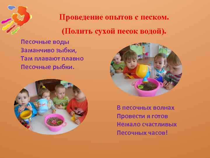 Проведение опытов с песком. (Полить сухой песок водой). Песочные воды Заманчиво зыбки, Там плавают плавно Песочные рыбки. В песочных волнах Провести я готов Немало счастливых Песочных часов!