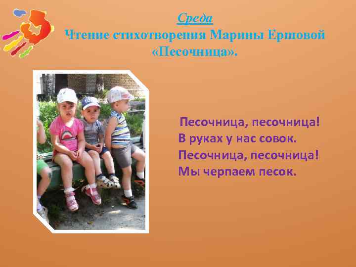 Среда Чтение стихотворения Марины Ершовой «Песочница» . Песочница, песочница! В руках у нас совок. Песочница, песочница! Мы черпаем песок.