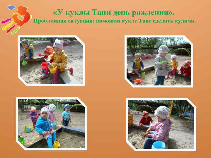 «У куклы Тани день рождения» . Проблемная ситуация: поможем кукле Тане сделать куличи.