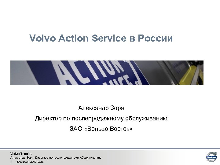 Volvo Action Service в России Александр Зоря Директор по послепродажному обслуживанию ЗАО «Вольво Восток» Volvo Trucks Александр Зоря, Директор по послепродажному обслуживанию 1 30 апреля 2009 года.