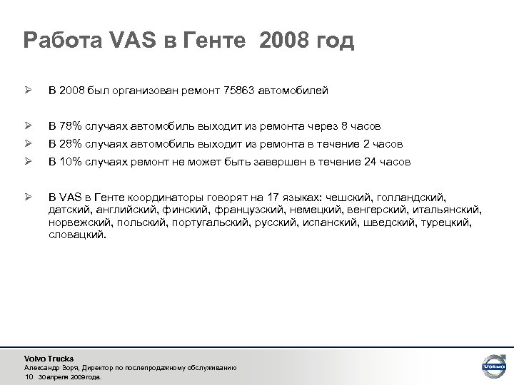 Volvo Trucks Александр Зоря, Директор по послепродажному обслуживанию 8 30 апреля 2009 года.