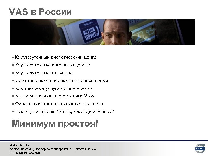 VAS в России · Круглосуточный диспетчерский центр · Круглосуточная помощь на дороге · Круглосуточная эвакуация · Срочный ремонт и ремонт в ночное время · Комплексные услуги дилеров Volvo · Квалифицированные механики Volvo · Финансовая помощь (гарантия платежа) · Помощь водителю (отель, командировочные) Минимум простоя! Volvo Trucks Александр Зоря, Директор по послепродажному обслуживанию 11 30 апреля 2009 года.