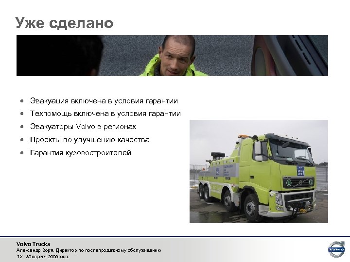 Уже сделано · Эвакуация включена в условия гарантии · Техпомощь включена в условия гарантии · Эвакуаторы Volvo в регионах · Проекты по улучшению качества · Гарантия кузовостроителей Volvo Trucks Александр Зоря, Директор по послепродажному обслуживанию 12 30 апреля 2009 года.