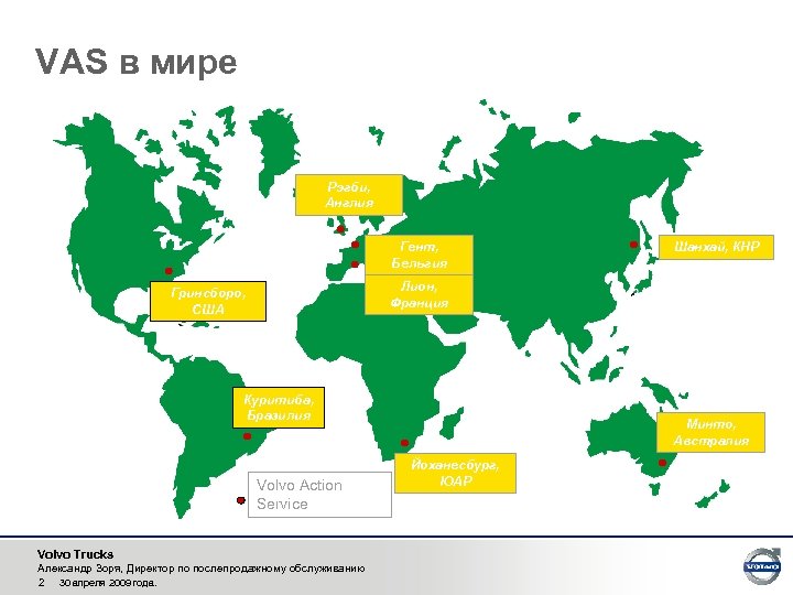VAS в мире Рэгби, Англия Гент, Бельгия Шанхай, КНР Лион, Франция Гринсборо, США Куритиба, Бразилия Volvo Action Service Volvo Trucks Александр Зоря, Директор по послепродажному обслуживанию 2 30 апреля 2009 года. Минто, Австралия Йоханесбург, ЮАР
