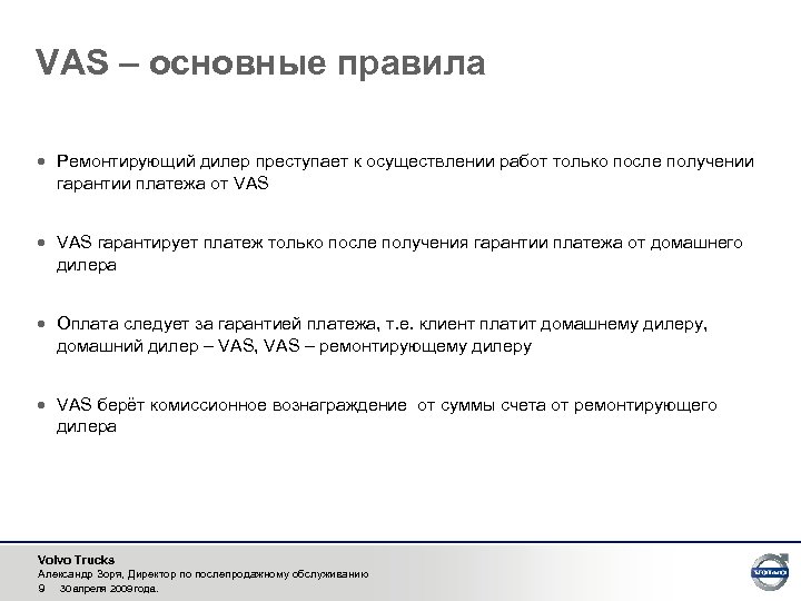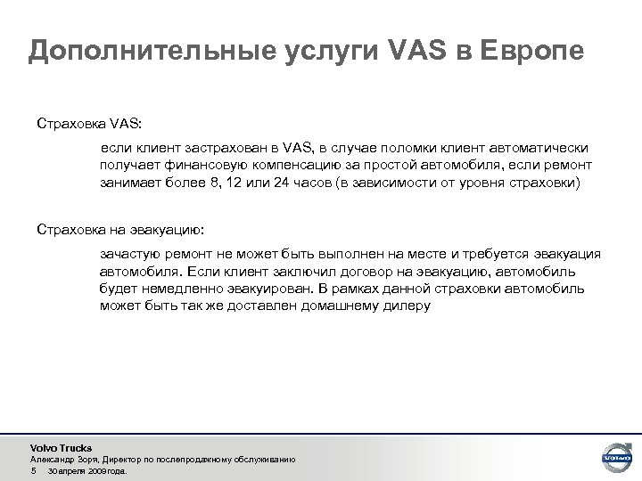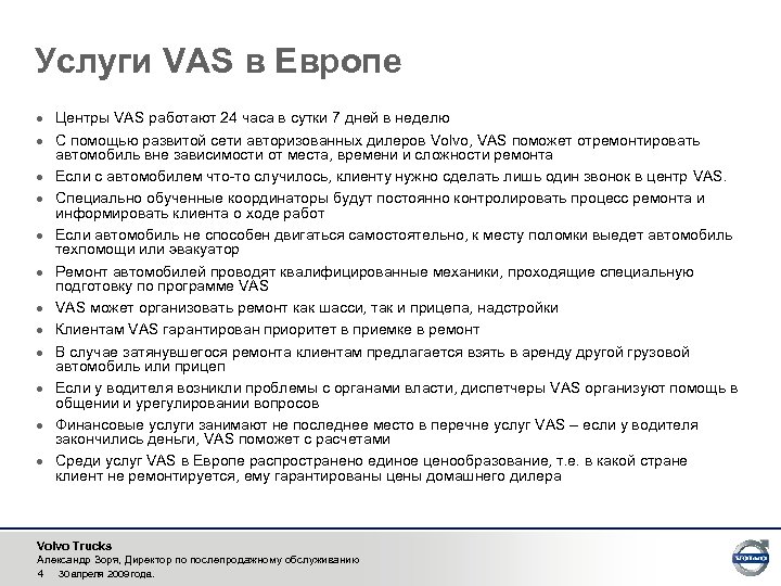 Услуги VAS в Европе · Центры VAS работают 24 часа в сутки 7 дней в неделю · С помощью развитой сети авторизованных дилеров Volvo, VAS поможет отремонтировать автомобиль вне зависимости от места, времени и сложности ремонта · Если с автомобилем что-то случилось, клиенту нужно сделать лишь один звонок в центр VAS. · Специально обученные координаторы будут постоянно контролировать процесс ремонта и информировать клиента о ходе работ · Если автомобиль не способен двигаться самостоятельно, к месту поломки выедет автомобиль техпомощи или эвакуатор · Ремонт автомобилей проводят квалифицированные механики, проходящие специальную подготовку по программе VAS · VAS может организовать ремонт как шасси, так и прицепа, надстройки · Клиентам VAS гарантирован приоритет в приемке в ремонт · В случае затянувшегося ремонта клиентам предлагается взять в аренду другой грузовой автомобиль или прицеп · Если у водителя возникли проблемы с органами власти, диспетчеры VAS организуют помощь в общении и урегулировании вопросов · Финансовые услуги занимают не последнее место в перечне услуг VAS – если у водителя закончились деньги, VAS поможет с расчетами · Среди услуг VAS в Европе распространено единое ценообразование, т. е. в какой стране клиент не ремонтируется, ему гарантированы цены домашнего дилера Volvo Trucks Александр Зоря, Директор по послепродажному обслуживанию 4 30 апреля 2009 года.
