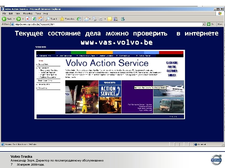 Текущее состояние дела можно проверить www. vas. volvo. be Volvo Trucks Александр Зоря, Директор по послепродажному обслуживанию 7 30 апреля 2009 года. в интернете