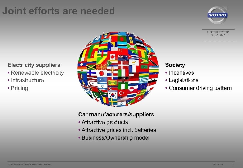 ELECTRIFICATION STRATEGY • 250 -350 vehicles / start of production Q 3 2011 • Lease: Sweden, Belgium, Netherlands, Germany, France, Austria, Switzerland • Research program / investigation of: Aging of batteries Driver / driving behaviour • PR fleet, China, US • Full service leasing contract – not for sale – Buy back • Monthly lease fee – Buy back • Use of selected local dealer and service work shops Johan Konnberg - Volvo Car Electrification Strategy 2012 -10 -23 12