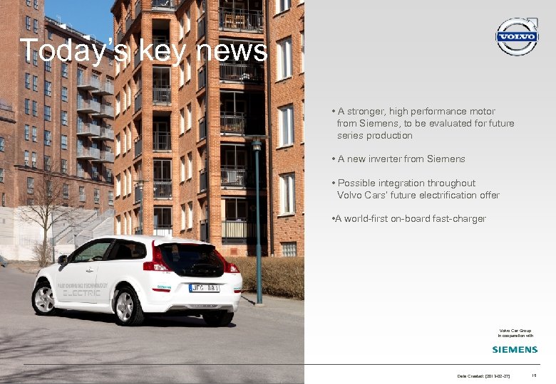 Today’s key news ELECTRIFICATION STRATEGY • A stronger, high performance motor from Siemens, to be evaluated for future series production • A new inverter from Siemens • Possible integration throughout Volvo Cars’ future electrification offer • A world-first on-board fast-charger Volvo Car Group in cooperation with Date Created: [2013 -02 -27] 15