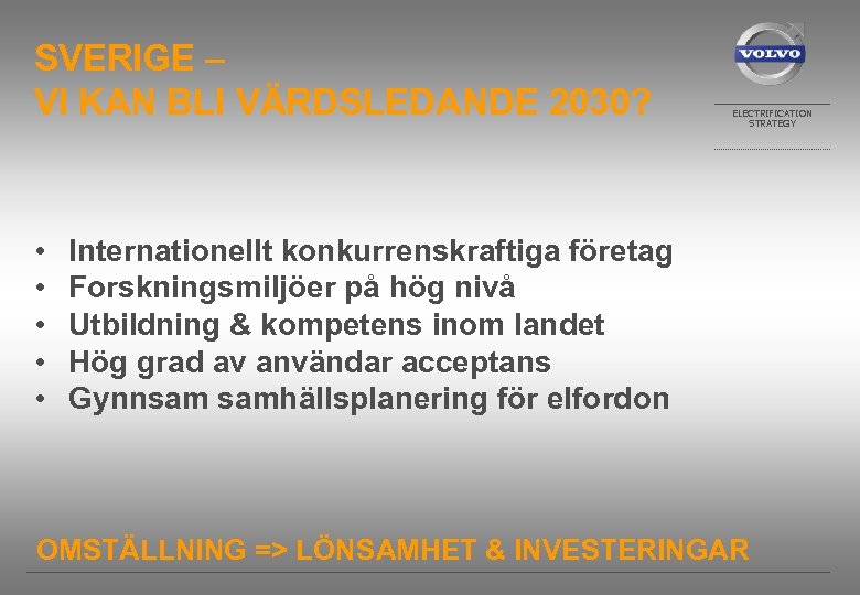 SVERIGE – VI KAN BLI VÄRDSLEDANDE 2030? • • • ELECTRIFICATION STRATEGY Internationellt konkurrenskraftiga företag Forskningsmiljöer på hög nivå Utbildning & kompetens inom landet Hög grad av användar acceptans Gynnsam samhällsplanering för elfordon OMSTÄLLNING => LÖNSAMHET & INVESTERINGAR