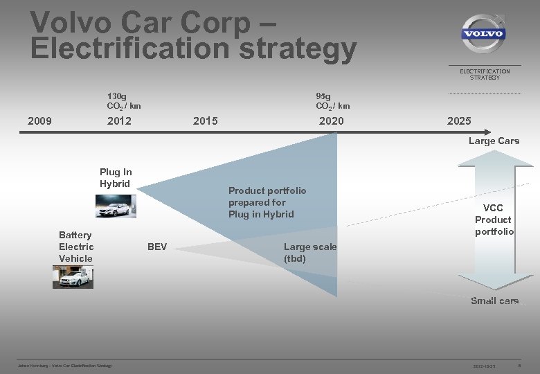 Volvo Car Corp – Electrification strategy ELECTRIFICATION STRATEGY 130 g CO 2 / km 2009 95 g CO 2 / km 2012 2015 2020 2025 Large Cars Plug In Hybrid Battery Electric Vehicle Product portfolio prepared for Plug in Hybrid BEV VCC Product portfolio Large scale (tbd) Small cars Johan Konnberg - Volvo Car Electrification Strategy 2012 -10 -23 8