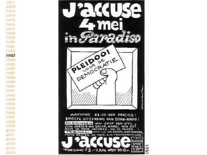 Wanneer de premier zijn minachting voor de politiek demonstreert, wanneer mensen geen woning krijgen en wetten tegen machtige grondspeculanten blijkbaar onmogelijk zijn, wanneer een staatssecretaris van Justitie keihard demonstreert hoe je de zwaksten kunt pesten, en dat in naam van recht en democratie, dan worden parlement, politiek en democratie verpest. (uit persbericht voor 4 mei bijeenkomst 1980)