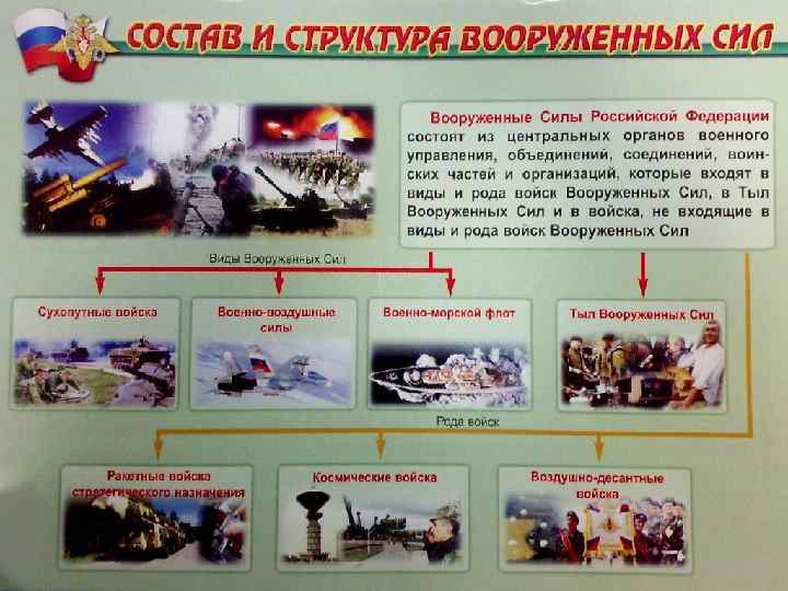 СУХОПУТНЫЕ ВОЙСКА. Наиболее многочисленный и разносторонний по боевому составу вид Вооружённых Сил. Они обладают большой огневой и ударной силой, высокой маневренностью и самостоятельностью. Оснащенные различными видами военной техники и оружия, они включают в себя органы военного управления, мотострелковые, танковые войска, ракетные войска и артиллерию, войска противовоздушной обороны (ПВО), являющиеся родами войск, а также специальные войска (соединения и части разведки, связи, РЭБ, инженерные, РХБ - защиты, ядерно-технические, технического обеспечения, автомобильные и охраны тыла), воинские части и учреждения тыла, другие воинские части, учреждения, предприятия и организации.
